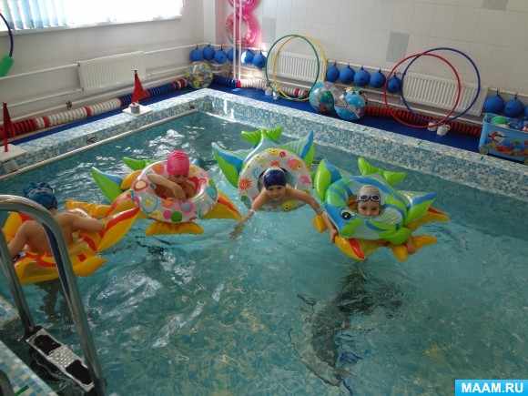 Как известно, положительным результатом любого обучения является приобретение определенных знаний и умений, поэтому показательным итогом занятий плаванием должен стать устойчивый навык плавания. Но если при обучении детей школьного возраста тренер обычно встречается с уже осознанной мотивацией у ребенка, то говорить об этом про детей трех лет не приходится. И здесь успех во многом будет определяться позицией родителей. Поэтому выработать у родителей доверие к инструктору по плаванию и пробудить интерес к занятиям я считаю немаловажной задачей для достижения успеха. Что касается дидактических материалов, формирующих информационную компетентность ребенка и подготавливающих его к освоению водного пространства, то, как отмечают некоторые специалисты из области дошкольного плавания, «семья испытывает «информационный голод» по данному вопросу. Большинство родителей слабо представляют, чем занимаются дети в бассейне ДОУ, как необходимо готовить ребенка к этим занятиям (физически и психологически). Родители не имеют достаточной информации, касающейся использования развивающих возможностей плавания в период летнего отдыха, необходимости дополнительных занятий в бассейне и пр.» (Чеменева А.А., Столмакова Т.В. «Система обучения плаванию детей дошкольного возраста»). Благотворное влияние плавания на организм человека известно каждому. Это не только тренировка сердечно-сосудистой и дыхательной систем за счет выполнения цикличных движений, укрепление опорно-двигательного аппарата и мышечного корсета, что помогает формированию правильной осанки, но и снятие нервного напряжения благодаря погружению в водную среду, а также создание условий для закаливания организма. Умение не только плавать, нырять, задерживать дыхание, но и просто достаточно долго лежать на воде подчас оказывается надежной страховкой от несчастных случаев. Казалось бы, что уже этого должно быть достаточно для того, чтобы родители без всяких сомнений отдали ребенка в руки инструктора по плаванию. Некоторые именно так и поступают, выбирая из двух рядом стоящих садиков тот, в котором есть бассейн. Но затем многие родители начинают терзаться вопросами, ответы на которые может дать только квалифицированный специалист. Каковы условия для занятий плаванием в детском саду? Чтобы увидеть бассейн, в котором ребенку предстоит учиться плавать, многие мамы с детишками приходят весной к нам в сад на День открытых дверей, во время которого они могут не только ознакомиться с окружающей обстановкой, но и увидеть, чему можно научиться, если регулярно посещать занятия. Обычно дети подготовительных групп с большим удовольствием демонстрируют свои плавательные навыки для мам с малышами. Каждую осень, встречаясь с родителями новичков на собраниях, я стараюсь не просто рассказать о своей профессиональной подготовке и познакомить их с техническими и санитарно-гигиеническими условиями для занятий, но и поделиться достижениями и планами на будущее, сопровождая слова демонстрацией видеоматериалов с водноспортивных праздников. Чтобы получить более полное представление о программе обучения, необходимо познакомить взрослых со всеми этапами освоения плавания. Как собрать ребенка в бассейн? Обычно это первый вопрос, который задают родители при встрече с инструктором п
